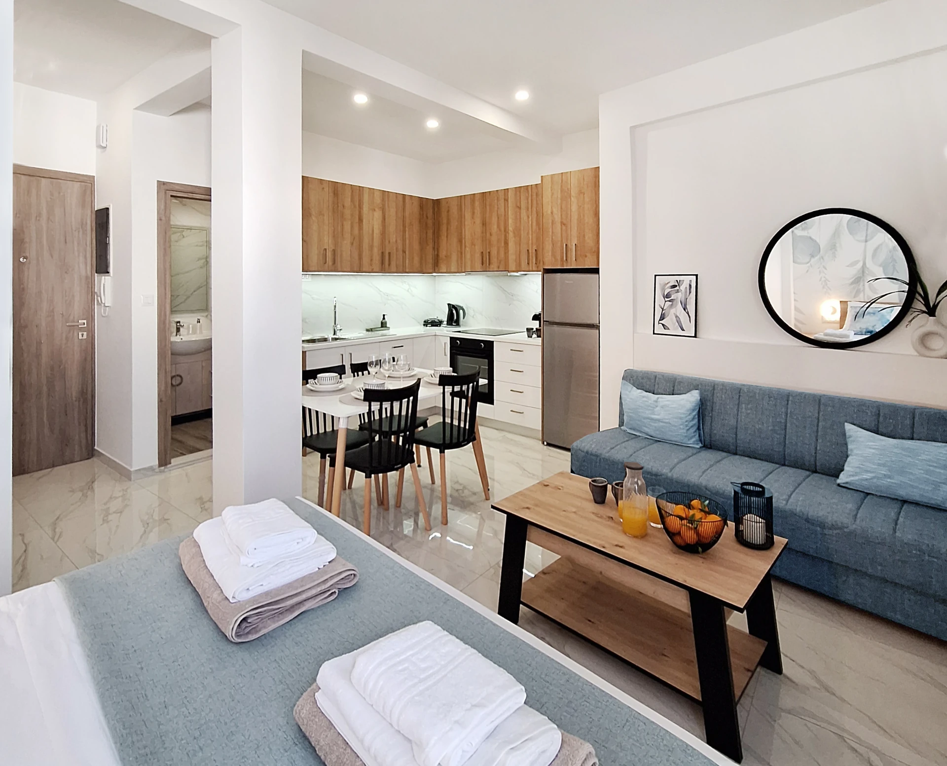 Αscend the stairs and discover an apartment that combines comfort with functionality. The kitchen, equipped with everything you need, allows you to cook your favorite meals. The dining area, perfect for both romantic dinners and family meals, is located next to the living room, where you can relax on the comfortable sofa and enjoy the TV. The bedroom, with its large balcony door, offers natural light and is equipped with another smart TV and a comfortable double bed. The bathroom is located in the center of the home to serve both areas.