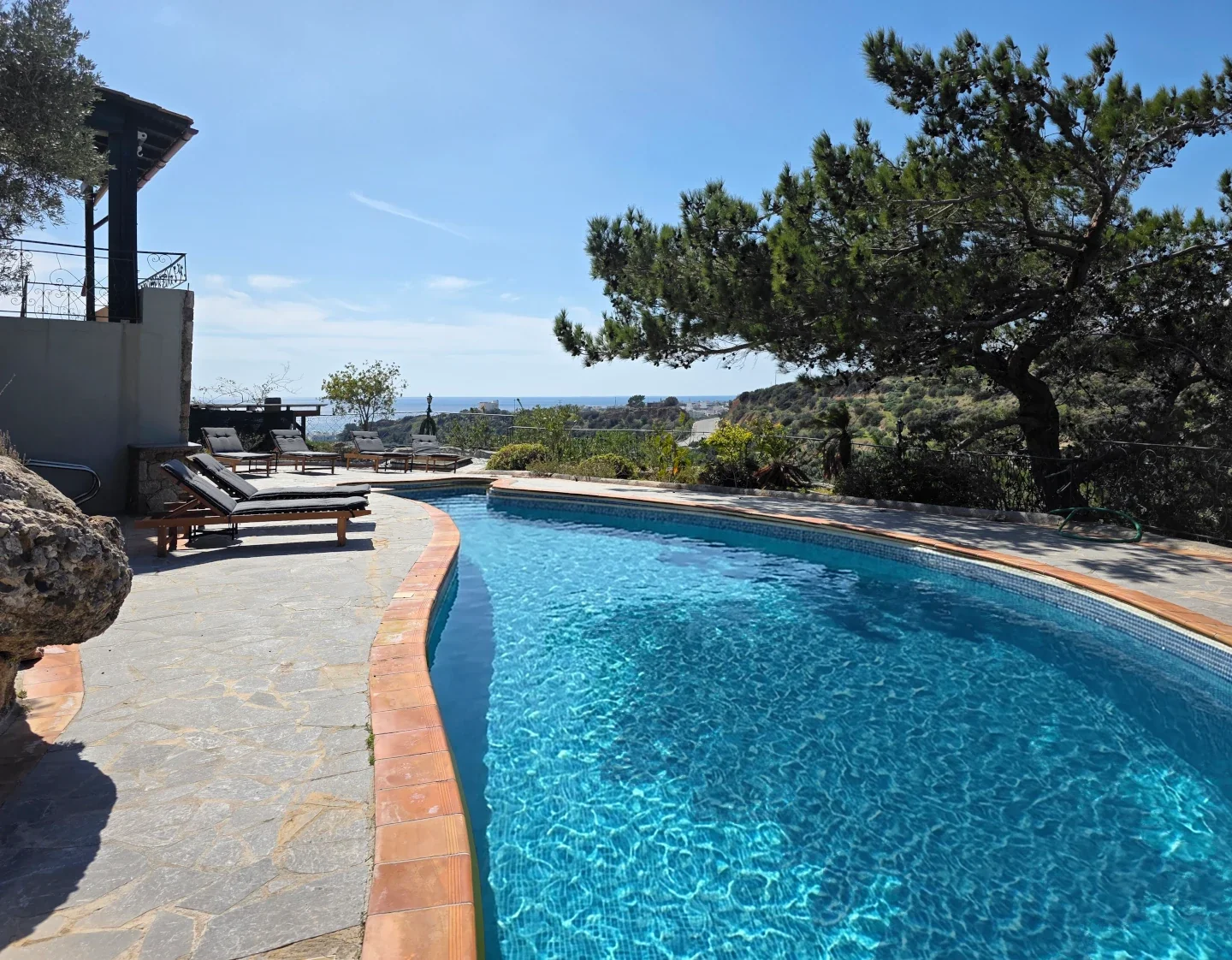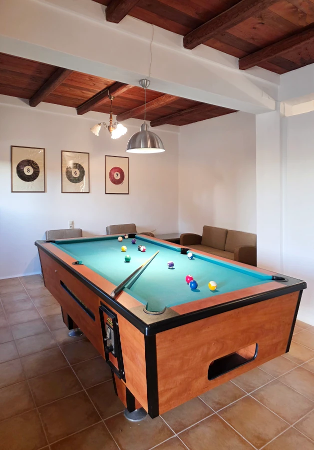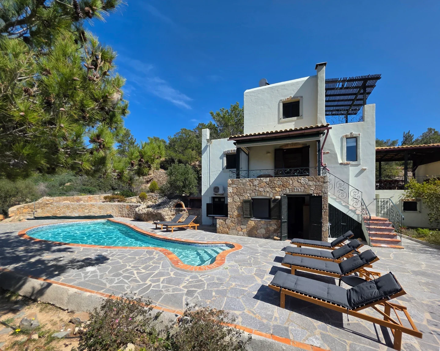 As you enter the main floor, you are welcomed by a bright, open-plan space featuring a warm living room, a fully equipped kitchen, and an elegant dining area. This level opens onto a veranda with an outdoor dining set, offering breathtaking views and a staircase that leads directly down to the pool. A comfortable double bedroom and a full bathroom complete this floor. An internal staircase leads to the upper level, a private sanctuary featuring an independent bedroom with its own en-suite bathroom and a secluded balcony with panoramic vistas. The lower level is designed for fun and relaxation, housing a third bedroom, a bathroom, and a dedicated billiards area that opens directly onto the garden and the private swimming pool. Whether you are enjoying a game of pool or soaking in the scenery from every corner of the house, this villa offers a seamless indoor-outdoor living experience defined by serenity and style.